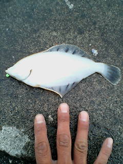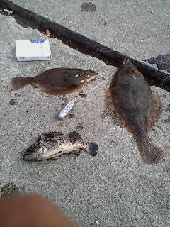 ブラー替えて、穴で3匹目 ソイを釣ったところで、戻って投げ竿あげてみると、マガレイWゲット。