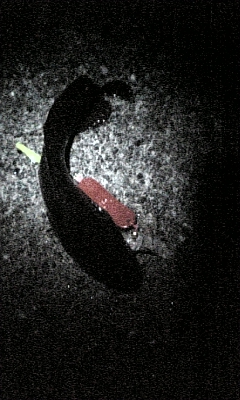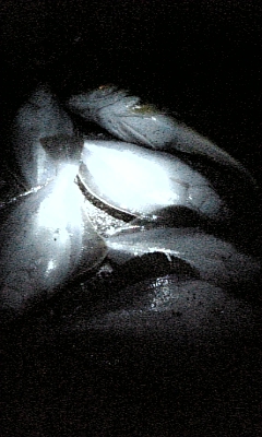 真っ暗になってチラホラ人が帰りだした。最後に引き上げてきた人によると、「潮引いたから、もうドンコしか釣れないよ、角のあたりのテトラで落ちて亡くなった方もいるから気をつけなよ」との事だった。