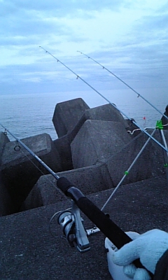 防波堤の外側に投げ竿2本、ブロックの穴ホジリ竿1本で釣り開始。