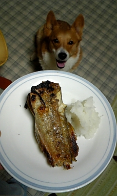 昨日、日本海の泊村で釣ってきたホッケの塩焼きと、何故か満面の微笑みで魚を見つめるタロウ(子分)。