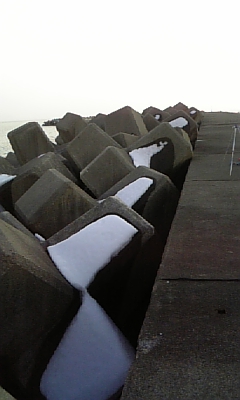 まだ若干テトラに雪が残っていて、雪の上は滑るし、海面は少しウネリがあるので怖い。投げれる場所探してウロウロ。