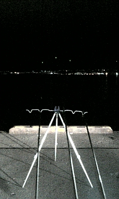 夜9時30分 厩岸壁 に場所移動。期待しないで朝まで投げっぱなして寝ちゃおうと思ったら、針には掛からなかったけど、右の竿にコツッコココッとアタリがあった。