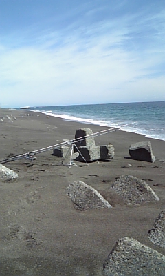 午前11時、何も釣れる気はしないけど、虎杖浜の砂浜 でちらっと竿出してみた。