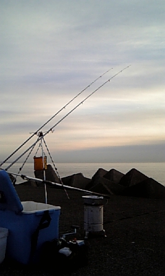 防波堤の中間手前で竿3本出そうと思ったら、1本凍っていて使用不能。
