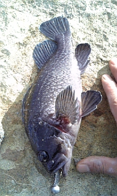 大型船通過の波に揺らされた餌についたクロゾイ(28cm)。