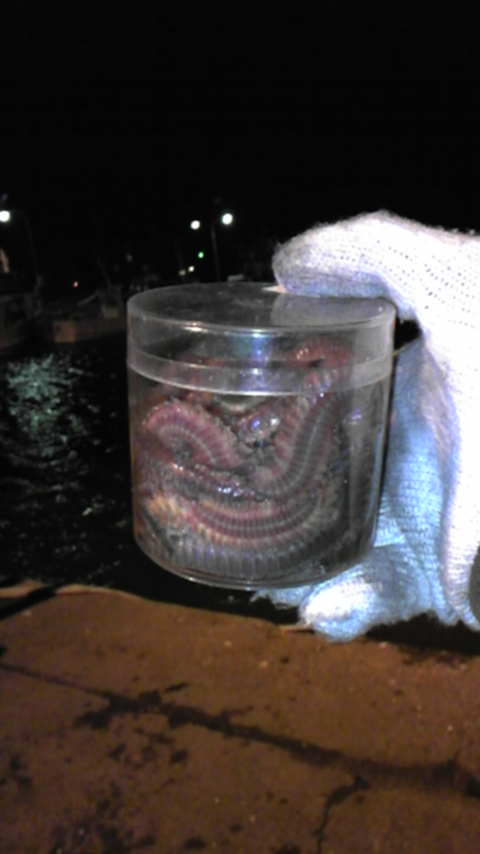夜の部はタモでイソメすくい