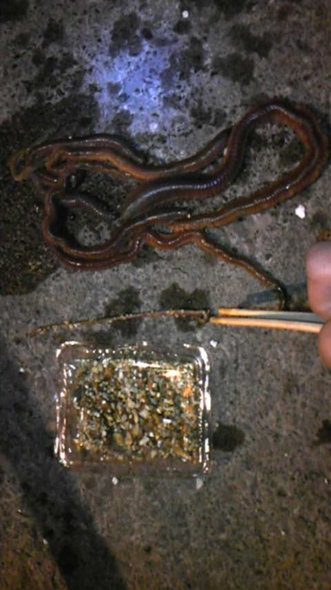 釣具店で購入した通常サイズのイソメ(割り箸で指してるイソメ)と比較すると、長さと太さが段違いで、大人と子供って感じ。