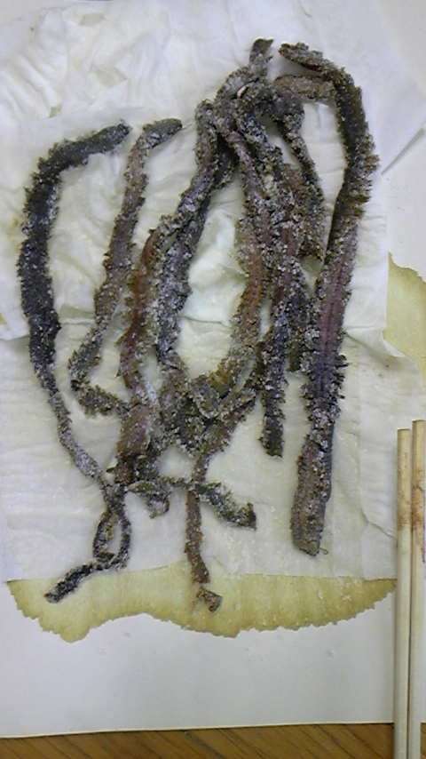 一夜明け…完成!名づけて「鬼塩イソメ和風醤油味」 、捕獲した時は、かなり生臭かったけど水分が抜けたら臭くなくなった。