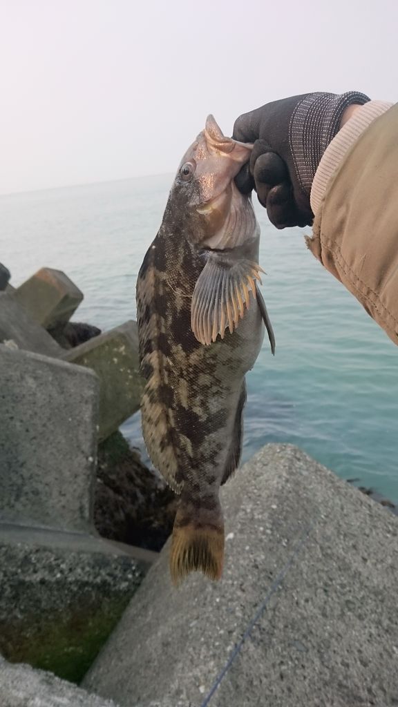 海面から黒く見える影(底の高さがある根)の近くに放って横を通してる時に釣れたアブラコ。