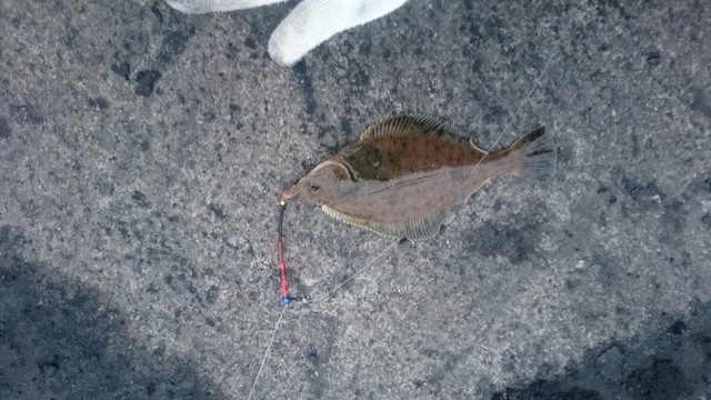 足元にも鰈が居るんじゃないかな?とルアー竿、サビキ用の錘に鰈針、イソメを付けて底に垂らして放置してたら小ぶりなアブラコが掛かっていた。