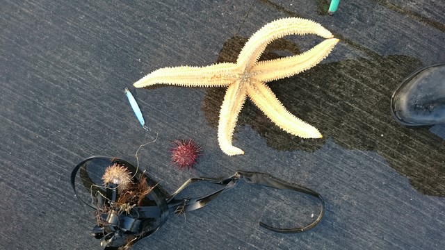底でビニール製のゴミとラインとデカいヒトデとウニが一緒に絡まってくっついてきた。
