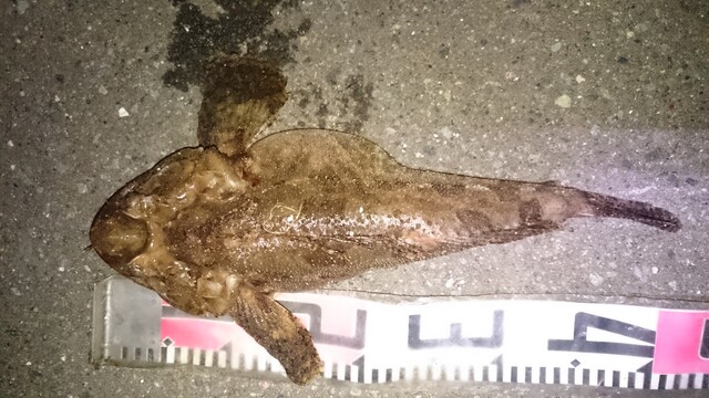 暗く静かで人気のない漁船溜まり、車からルアー竿とポーチを手に、ササっと係留してる漁船の間から船の向こうへ軽くワームを放り数投目、フリーフォールで着底を待って、少し底をひいてきてたら、ズシ、重っ!!