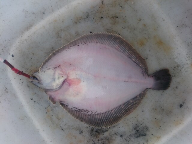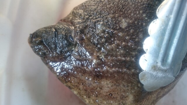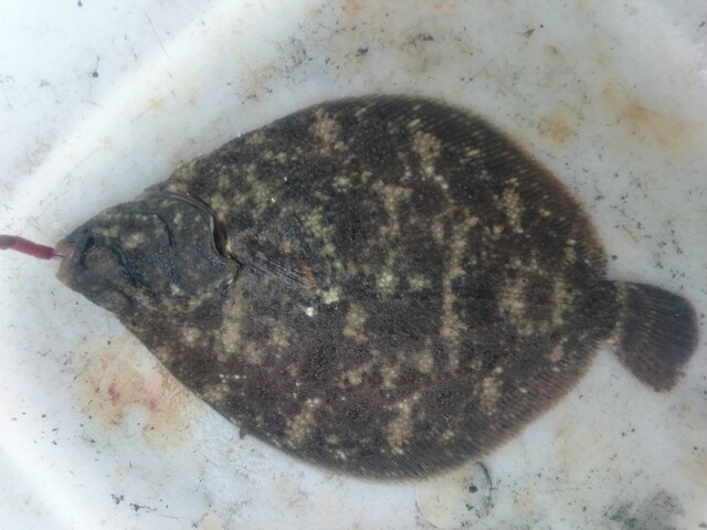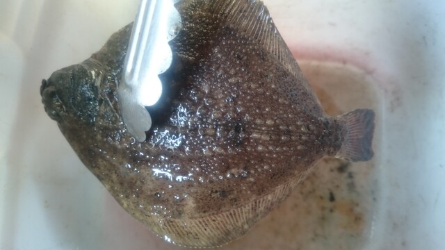 久しぶりに竿先が揺れて、なんか20cmくらいのピラピラ小さなが釣れたな〜と思ったら、見たことのない表面が硬くてザラザラ、フィッシュイーターのように口が大きめで、丸みを帯びた形状の謎のカレイ。